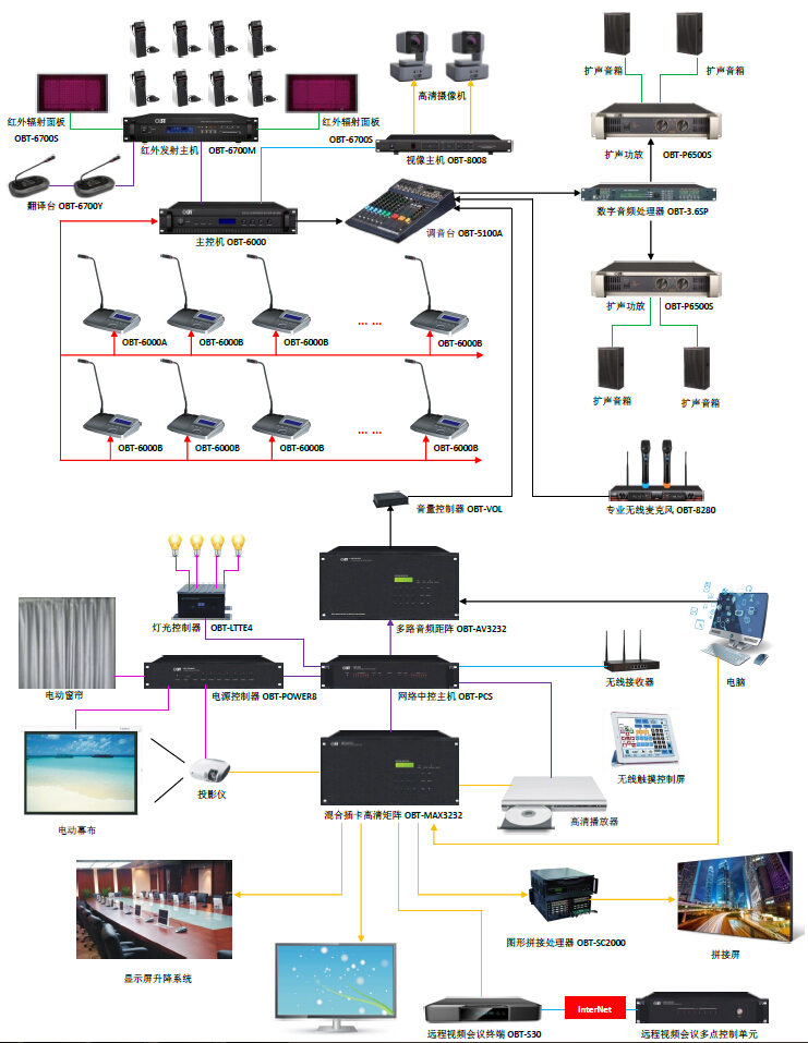 1)擴(kuò)聲系統(tǒng)設(shè)計(jì):在多媒體系統(tǒng)會議主要是以會議功能為主的場所,對擴(kuò)聲系統(tǒng)而言,其系統(tǒng)設(shè)計(jì)要求達(dá)到正常的標(biāo)準(zhǔn)之外,還應(yīng)考慮系統(tǒng)的兼容性、整體性、擴(kuò)展性、操作性、資源共享等問題,因而我們緊密結(jié)合建筑聲學(xué)設(shè)計(jì)擴(kuò)聲系統(tǒng),采用集中式和分散式結(jié)合的擴(kuò)聲設(shè)計(jì),使整個(gè)會場的聲場均勻,響度合適,高保真重放,無失真、嘯叫等問題。