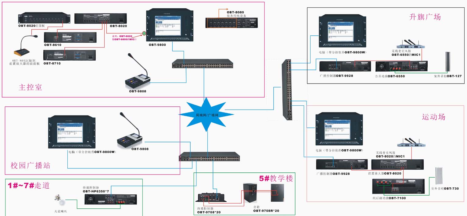 2、教室區(qū)域:學(xué)校的核心區(qū)域,在每個(gè)教室設(shè)置IP網(wǎng)絡(luò)廣播終端,遙控操作,實(shí)現(xiàn)網(wǎng)絡(luò)課件播放,具有快速定位及復(fù)讀、變速等語(yǔ)音室的功能。