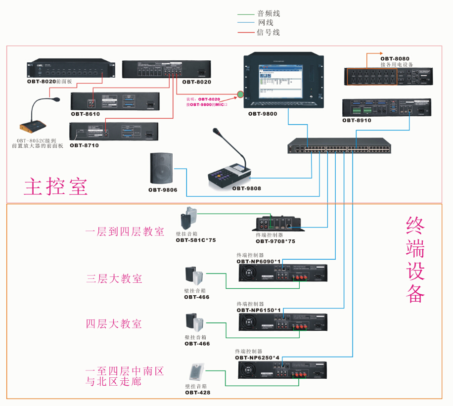 4、各分區(qū)設(shè)置:廣播區(qū)域(除教室外),每個區(qū)域配置IP網(wǎng)絡(luò)終端適配器(帶功率)、或IP網(wǎng)絡(luò)終端適配器與功率放大器的發(fā)配使用,根據(jù)不同區(qū)域選配不同的音箱進(jìn)行擴(kuò)聲。